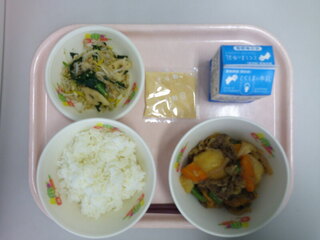 ごはん♪きなこふりかけ♪肉じゃが♪小松菜とれんこんのごま和え♪牛乳♪