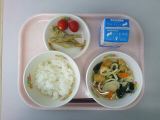 ごはん♪根菜うどん♪いわしの天ぷら♪ミニトマト♪牛乳♪