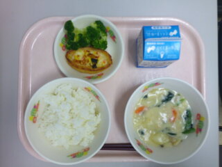 ごはん♪かぼちゃグラタン♪ゆでブロッコリー♪ほたて貝のクリーム煮♪牛乳♪