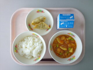 ごはん♪えびとポテトのチリソース煮♪ぎょうざ♪牛乳♪