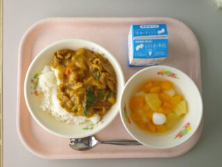 秋カレーライス♪白玉入りフルーツポンチ♪牛乳♪