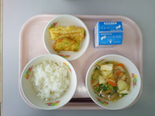 ごはん♪いかの天ぷら♪はんぺんの磯辺揚げ♪じゃがいもの味噌汁♪牛乳♪