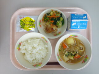 ごはん♪牛乳♪鶏肉の塩こうじ焼き♪小松菜のおひたし♪じゃがいもの味噌汁♪ハニーピーナッツ♪