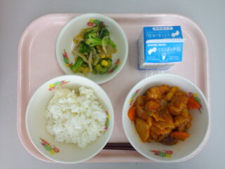 ごはん♪牛乳♪鶏肉とさつまいものケチャップ和え♪ブロッコリーのサラダ♪
