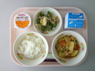 ごはん♪牛乳♪じゃがいものそぼろ煮♪梅酢和え♪みかんゼリー♪