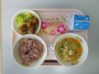 牛乳♪赤飯♪ごま塩♪若鶏の竜田揚げ♪ゆで野菜♪じゃがいもの味噌汁♪お祝いクレープ♪