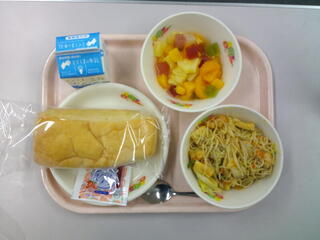 パン いちごジャム 牛乳 焼きビーフン フルーツカクテル