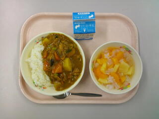 夏野菜入りカレーライス 牛乳 ナタデココ入りフルーツポンチ