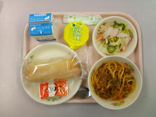 小型プレーンパン クリームマーガリン 牛乳 スパゲッティミートソース コールスローサラダ