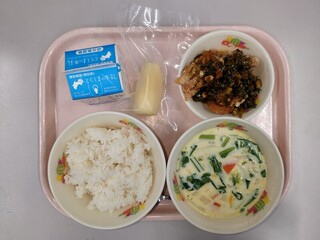 ごはん 牛乳 とり肉のねぎソースあえ コーンポタージュ りんご