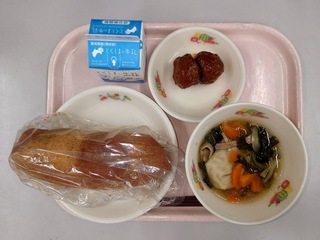 きなこ揚げパン 牛乳 海鮮ワンタンスープ 肉だんごのケチャップ煮