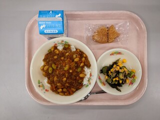 《150周年記念献立》 キーマカレー 牛乳 海藻サラダ めでたいやき(カスタード味)