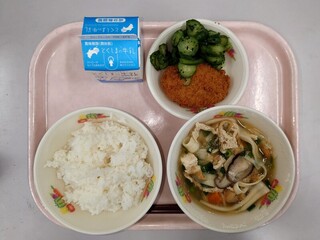 ごはん 牛乳 かつおカツ きゅうりのかおりあえ ふしめん汁