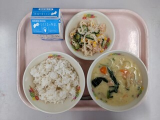 麦ごはん 牛乳 ほうれん草のクリーム煮 はりはりサラダ