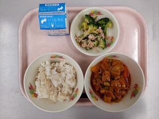 《全国学校給食週間》 麦ごはん 牛乳 徳島産れんこん入りポークビーンズ ブロッコリーのツナあえ