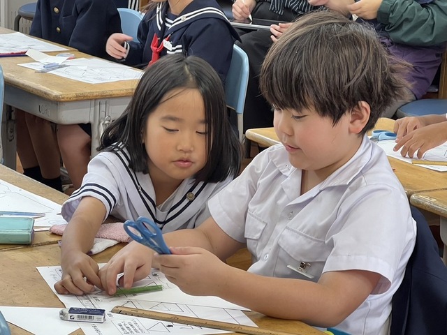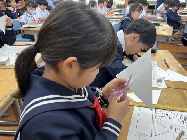 目標:三角形や四角形を切る活動を通して、図形の構成要素に着目しながら三角形と四角形の仕組みを理解することができる。【思考力・判断力・表現力等】