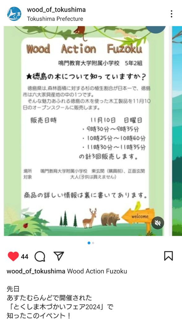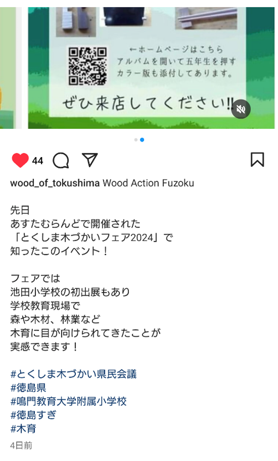木づかいフェアでの広報活動をしたおかげで、5年生での取り組みをSNSにとりあげていただきました。これからも、人とのつながりを大切にしながら、たくさんの人に徳島の木の魅力や本校STEAMIC教育の取り組みを知ってもらうために広報活動にも力を入れていこうと思います。